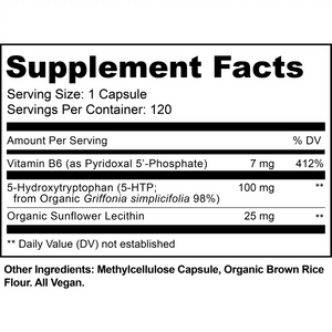 Why our 5-HTP? Made with all organic ingredients - Griffonia simplicifolia with the highest available potency standardized at 98%. B6 [P5P] which is needed to help convert more of the 5HTP to serotonin. Organic Sunflower Lecithin for enhanced absorption and greater bioavailability.