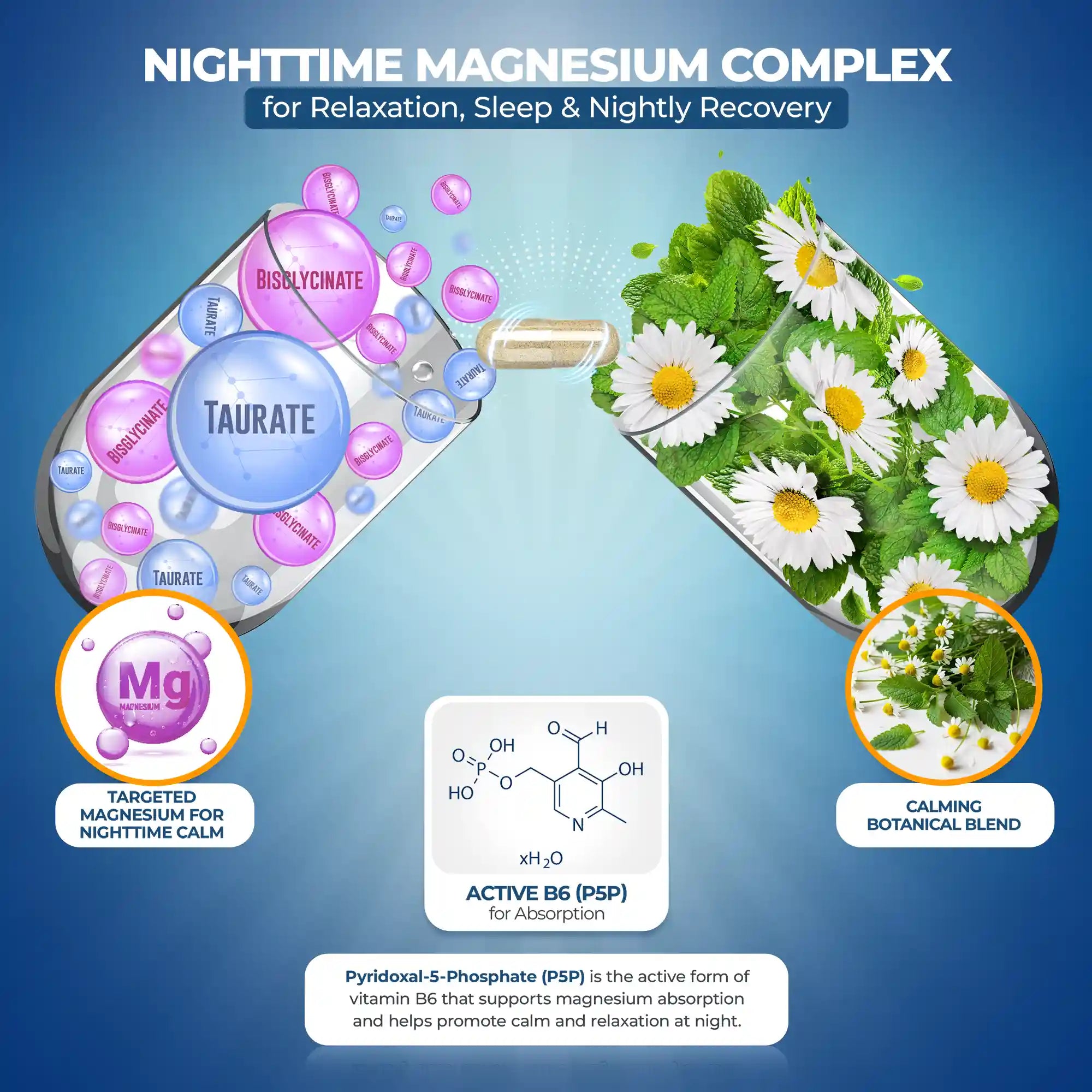 Active B6 (P5P) for Superior Absorption: - Formulated with 150 mg of gentle high absorption magnesium, bisglycinate and taurate, chosen specifically to support relaxation and evening wind-down. Uses the active form of vitamin B6 to help improve magnesium absorption and effectiveness at night.