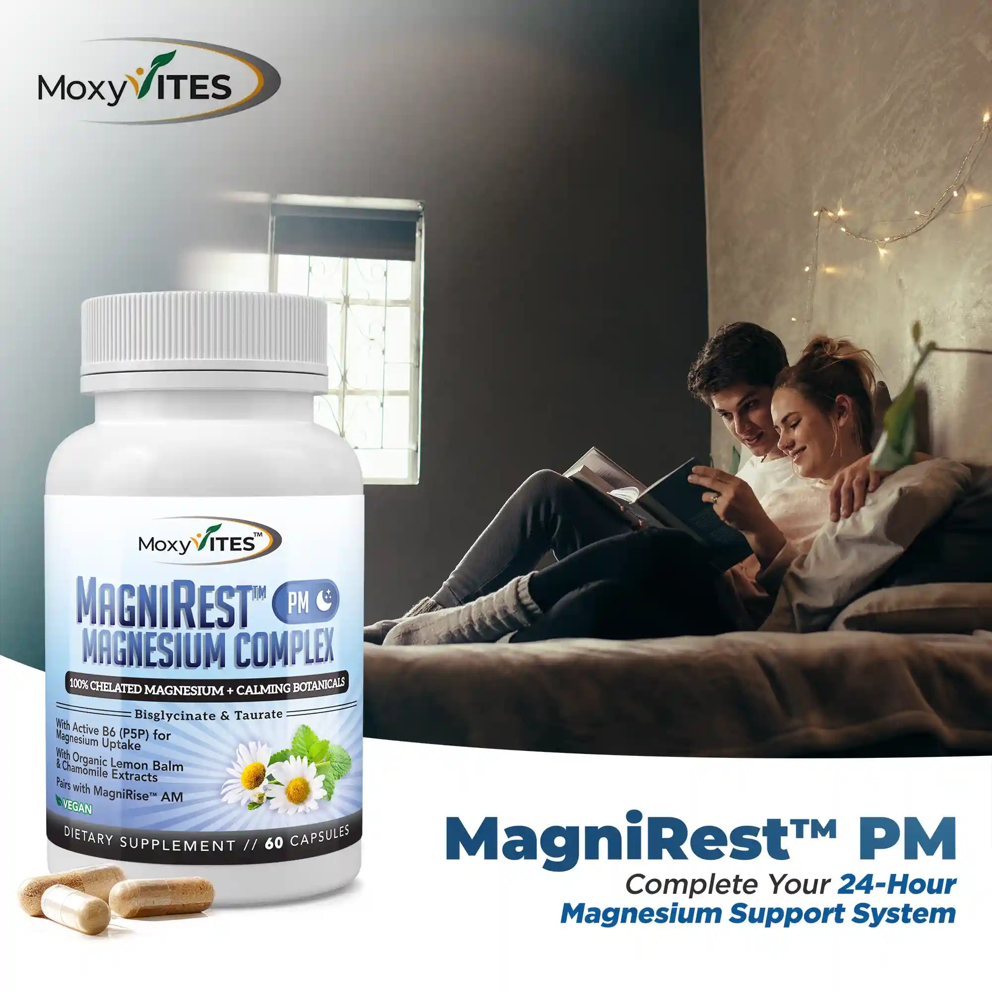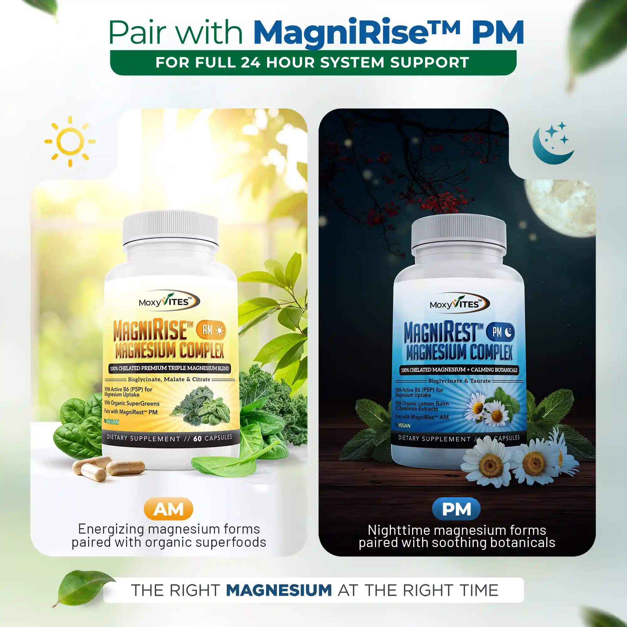 24 Hour System Support: Pairs with MagniRise™ AM to deliver “the right magnesium at the right time” for complete, around-the-clock magnesium support.